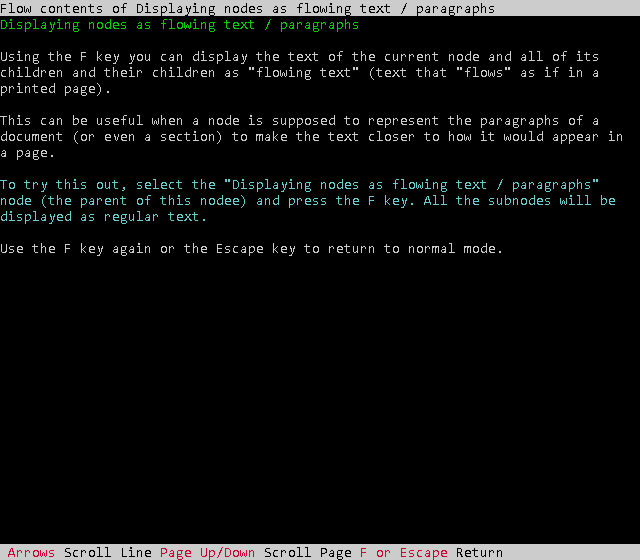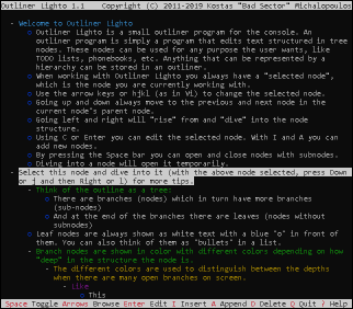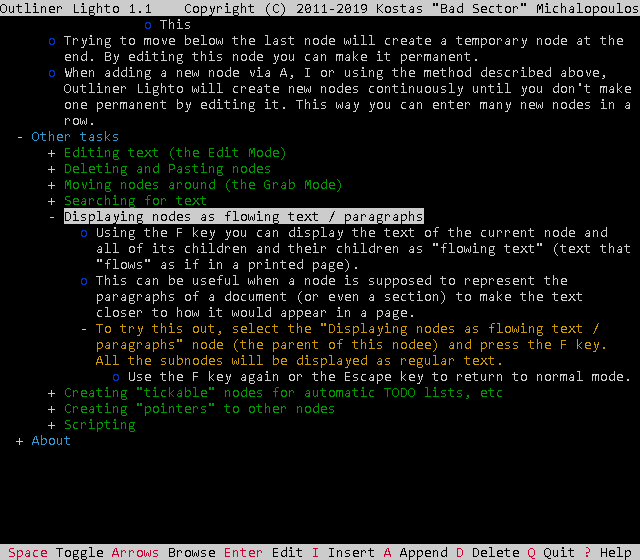 Outliner Lighto comes with documentation in the form of man pages in the source code distribution and the Linux and Haiku binaries as well as their HTML conversion in all binaries. It also has a scripting reference (only for Outliner Lighto specific functionality) in all versions and the program itself has a simple key reference screen.